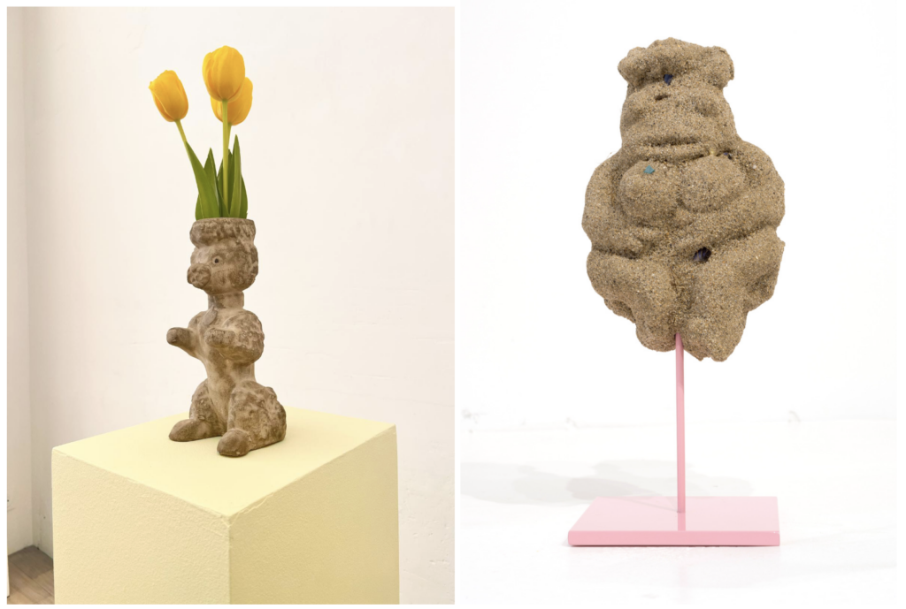 Olivier Millagou, à gauche : Sculpture périmée (Caniche) (2023), scellement chimique, et à droite : Varappe (2019), plâtre, sable, base en émail rose © courtesy Galerie Sultana, Paris.
